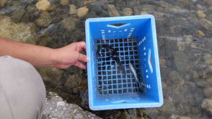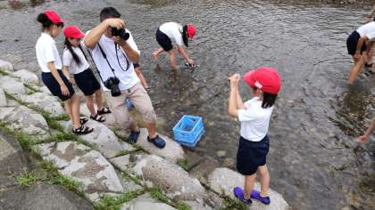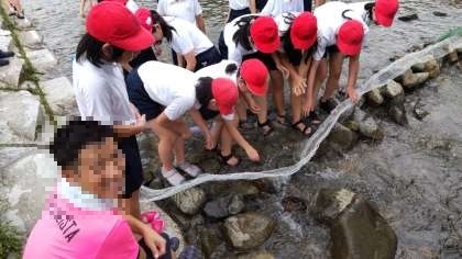 魚つかみが始まりました。女の子が「ワー、キャー」という悲鳴をあげながら、おもいっきりニジマスをつかんでいます。かわいそうに、ニジマスは次々と昇天し塩を振られて食べられる運命!