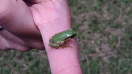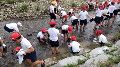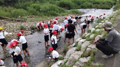 男の子たちは先に焼き板磨きです。女の子の魚つかみが終わったら、新しい元気なニジマスが放流されます。小さなカエルも見つけました。