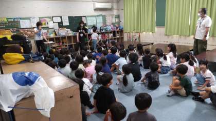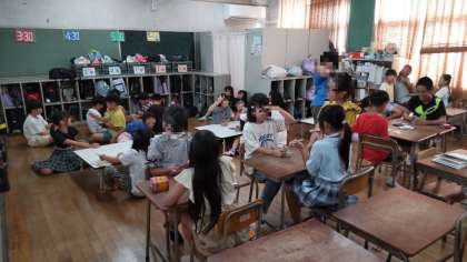 夏休みの「いきいき」活動の様子です。クーラーが入っていますが、2教室で100人以上来ています。お昼はお弁当を食べます。午前中はプール開放に参加する児童もいます。学校の図書室で読書をしたり、体育館で体を動かしたり、「いきいき」教室で宿題に取り組んだりしています。