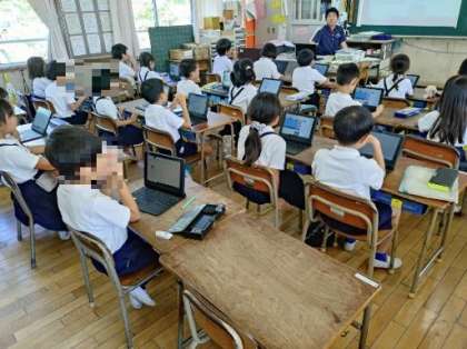 2年生は「スクラッチ」というソフトを使って、左右に移動してジャンプして得点を得る簡単なプログラミングの作成に取り組んでいました。命令をいくつか重ねていき簡単なゲームの作成ですが、初めてでなかなか苦労していました。