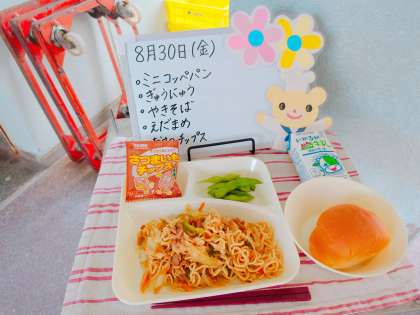 今日の給食は、ミニコッペパン、牛乳、焼きそば、枝豆、おさつチップスです。