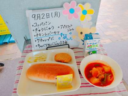 今日の給食は、コッペパン、牛乳、チキンレバーカツ、ケチャップ煮、キャベツのバジル風味サラダ、アプリコットジャムです。
