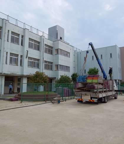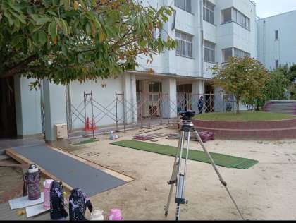 本日は、足場をたてています。子どもたちの学習にできるだけ影響が出ないように作業をしていただいております。