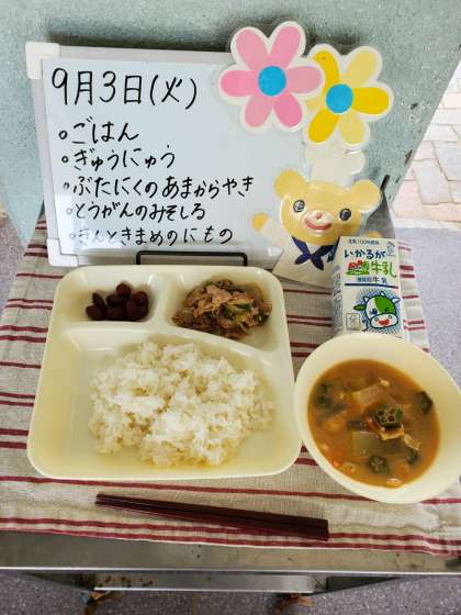 今日の給食は、ごはん、牛乳、豚肉の甘辛焼き、冬瓜のみそ汁、金時豆の煮ものです。