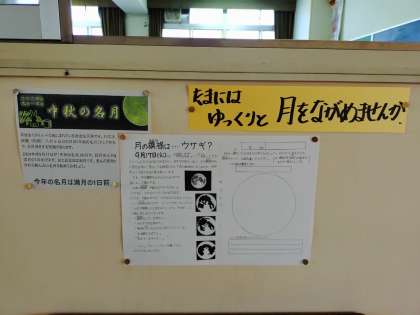 理科室の廊下側にこんな呼びかけコーナーがありました。9月17日は「中秋の名月」です。夜空を見て月の黒いところの見え方を観察しましょう。とありました。