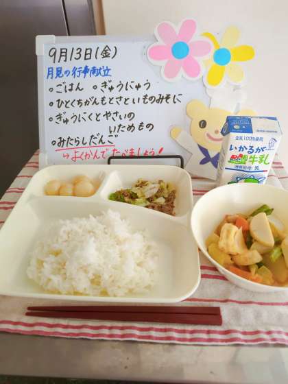 ごはん、牛乳、一口がんもと里芋のみそ煮、牛肉と野菜のいためもの、みたらしだんごです。