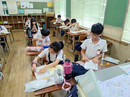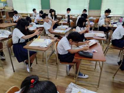 4年生は注射器を使って、空気を圧して空気のかさと手ごたえを調べていました。