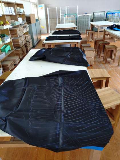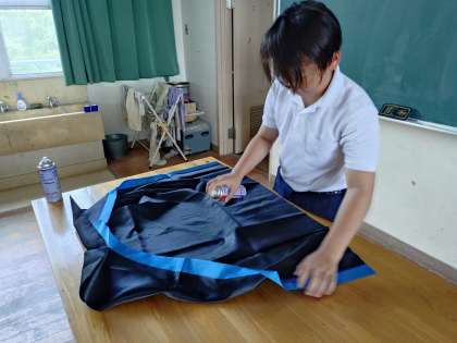 6年生の団体演技に使う法被づくりが進んできました。自分の好きな文字を切り取り法被に色を付けるのに、濡れてはいけないところに防水スプレーをかけていました。きっと全員着ると迫力があると思います。