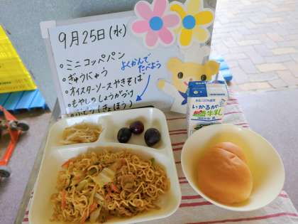 今日の給食は、ミニコッペパン、牛乳、オイスターソース焼きそば、もやしのしょうがづけ、ぶどう(巨峰)です。