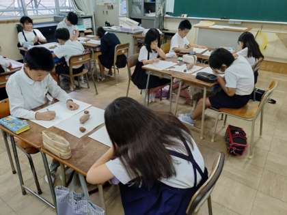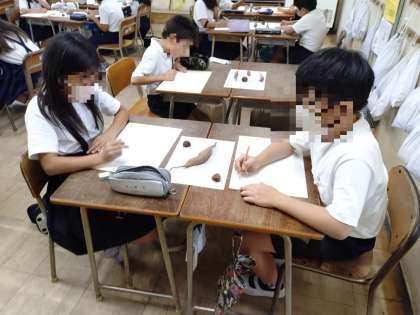 4年生は、サツマイモと栗を題材に線描を鉛筆で描いていました。ふたりの前に実物を置いた、秋の風景を描いていました。教室は静まり返り、集中して描いていました。聞こえるのは、鉛筆の音だけでした。