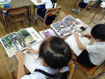 2年生は国語科で「ビーバーの大工事」という説明文を読み、ビーバーの特徴や行動の様子を読み取っていきました。そのあと、東住吉図書館で借りた動物についての本を使って、動物の特徴や行動の様子、住んでいるところや食べ物などを紹介する作文を書いていました。発表会が楽しみです。