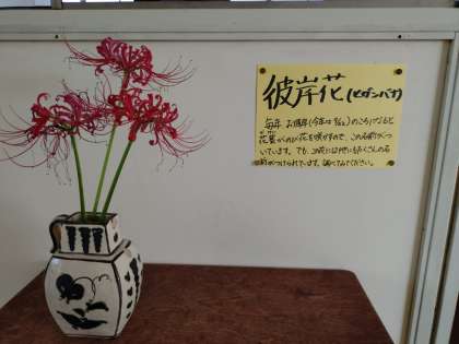 理科室の前には、ヒガンバナの切り花が置いてありました。秋ですね。マンジュシャゲとも呼ばれます。この花は、花が咲いてから葉が出てきます。