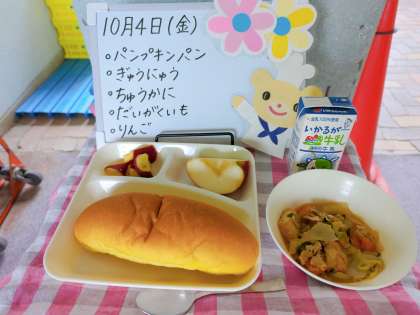 給食は、パンプキンパン、牛乳、中華煮、大学いも、りんごでした。
