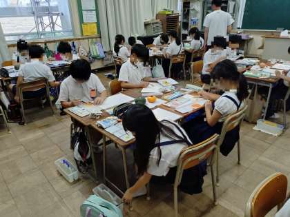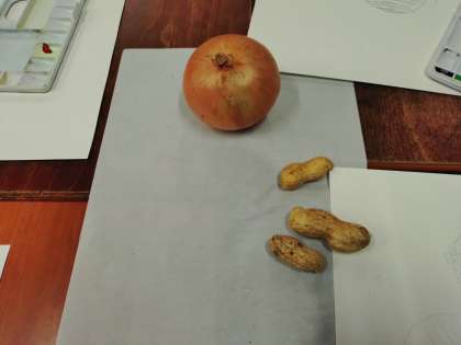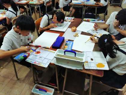 4年生は「栗とサツマイモ」の鉛筆画をおえて、今度は「玉ねぎと落花生」の水彩画に取り組み始めました。どちらも茶色系統の色です。で、その色の違いや、筋の違いを水彩絵の具で表していきます。塗る方向や色の調節の仕方、影の付け方などを考え、4人一組で取り組んでいました。