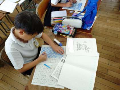 2年生は図形の学習が終わった後、正方形の中の直角三角形に色を塗って敷き詰めていました。