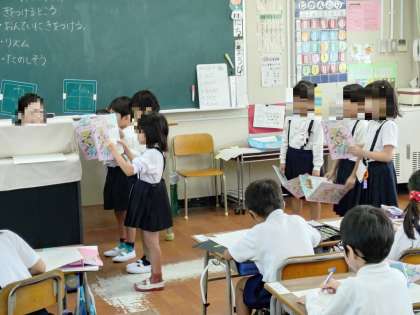 1年生の教室をのぞくと、先生がオルガンを弾き、その音に合わせて2名から3名で「歌のテスト」が行われていました。少々緊張気味の表情でした。