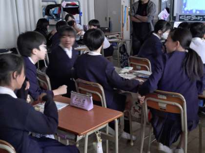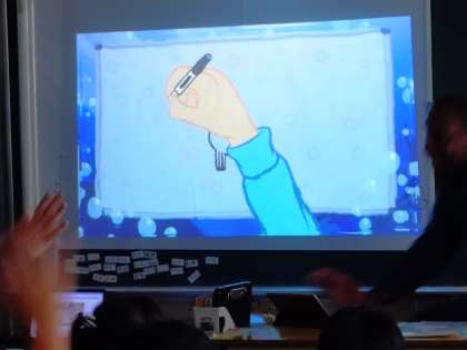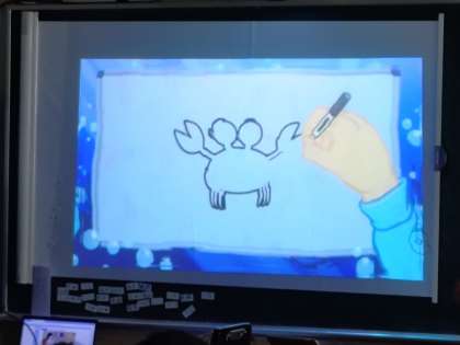 6年生の教室では、C−NETのロイド先生が英語の授業をしていました。その中で、海の生物を書くのに、途中で止め、「さあ、何の生物でしょうか?」というゲームをしていました。6年生はノリノリです。ドルフィン、クラブ、シェル、ジェリーフィッシュ(クラゲ)とかいろいろ言っていました。英語を楽しみながら覚えようね。