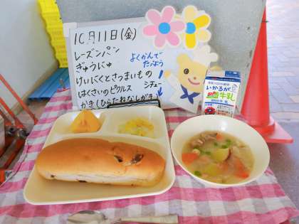 今日の給食は、レーズンパン、牛乳、鶏肉とさつまいものシチュー、白菜のピクルス、柿(平核無柿)です。