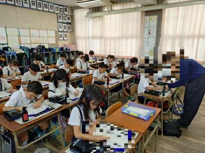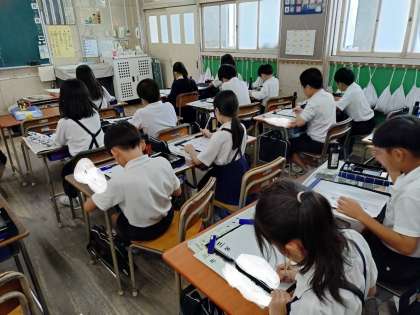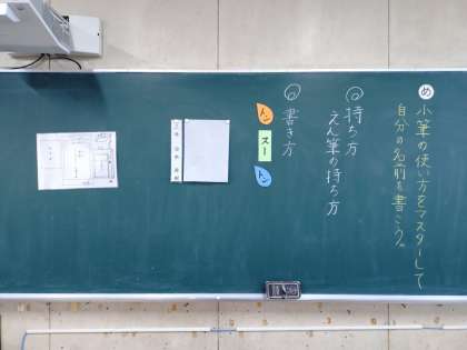 3年生は自分の名前をパウチしてもらって、小筆の指導を受けていました。小筆は太筆と違って、鉛筆もちで手首の骨を半紙にくっつけて書きます。太筆はまっすぐ筆を持ち、肘をはり、肩を動かして書いていきます。なかなか、指先の動きだけで書くのは慣れていないようで、ぎこちない動きになっている児童もいました。