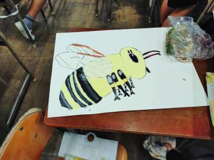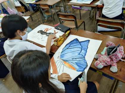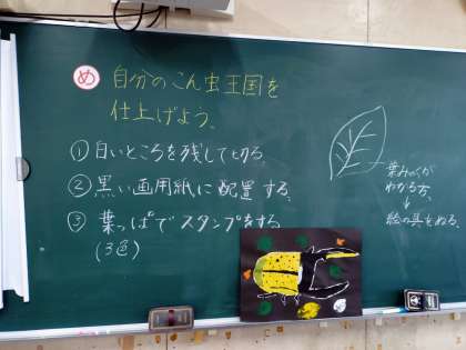 3年生は画用紙いっぱいに昆虫を描き、それを切り取って色画用紙にはりつけて、昆虫の絵をダイナミックに描いていました。とても迫力のある絵になりました。題材は、インターネットで調べました。
