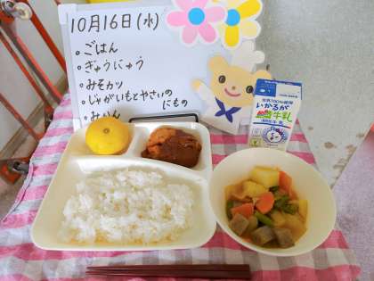 今日の給食は、ごはん、牛乳、みそカツ、じゃがいもと野菜の煮物、みかんです。