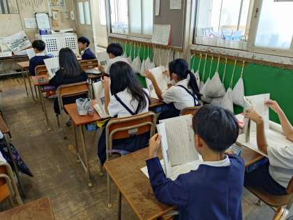 新聞の社説に書かれてあることを、短くまとめていく力の育成にもなります。単元の学習計画を立てた後、教科書を手に持って微音読していました。