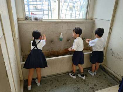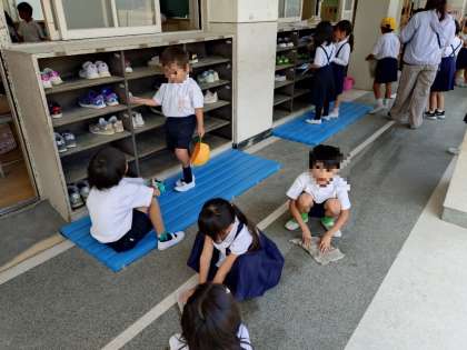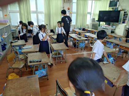 1年生は教室掃除で、廊下をぞうきんで拭いたり、机を協力して運んだり、ほうきで床をはいたりと掃除が大変上手になってきました。さすがに入学式から半年たつと成長しますね。