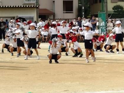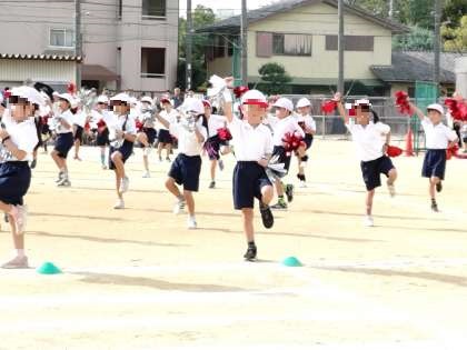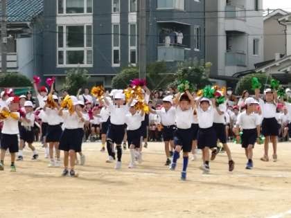 1年生は6色の飾りを両手首につけ、マリオの歌で始まり、リズミカルに演技しています。