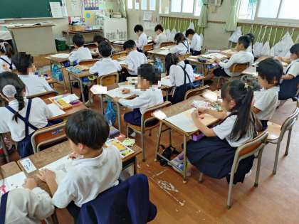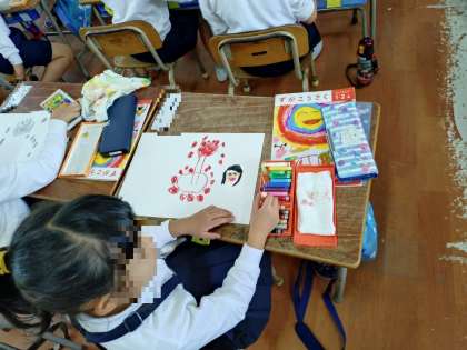 1年生は先週の土曜日の体育参観の思い出をクレヨンを使って絵に表していました。「リズム体操」と「玉入れ」でしたが、玉入れを描く子がほとんどでした。