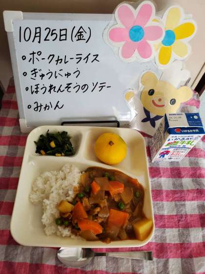 今日の給食は、ポークカレーライス、牛乳、ほうれん草のソテー、みかんでした。