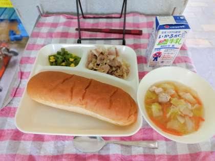 今日の給食は、黒糖パン、牛乳、豚肉のガーリック焼き、鶏肉と野菜のスープ、三度豆とコーンのソテーです。