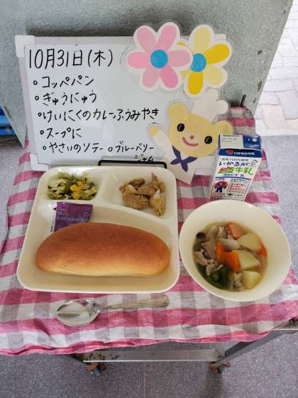 今日の給食は、コッペパン、牛乳、鶏肉のカレー風味焼き、スープ煮、野菜のソテー、ブルーベリージャムです。