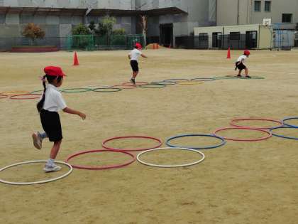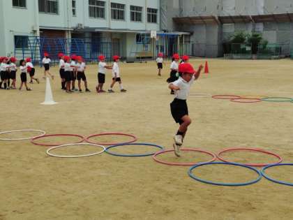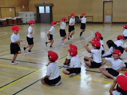 1年生は、リズム体操の評価や機敏な動きの体育をしていました。