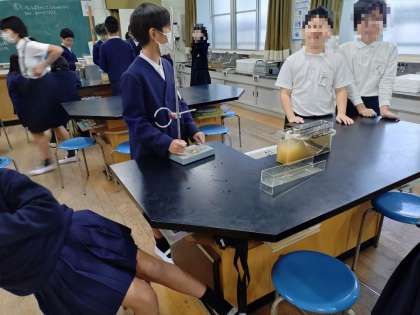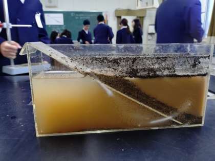 その前に地層はなぜできるかを「地層堆積実験装置」を傾けて、上から土と水を一緒に流して地層のでき方を観察・実験していました。そっと流したので、見事に地層ができていました。