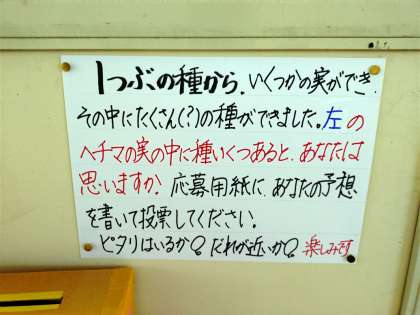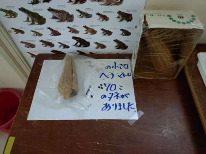 理科室では「ヘチマの種の個数あて」が始まっています。小さなヘチマには70個の種があったそうです。「では、大きなヘチマに入っている種の数はどれくらいでしょうか?」というクイズです。応募用紙に名前を書いて、応募箱に入れています。明日が締め切りです。