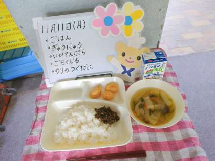 今日の給食は、ごはん、牛乳、いかてんぷら、五目汁、のりのつくだにです。