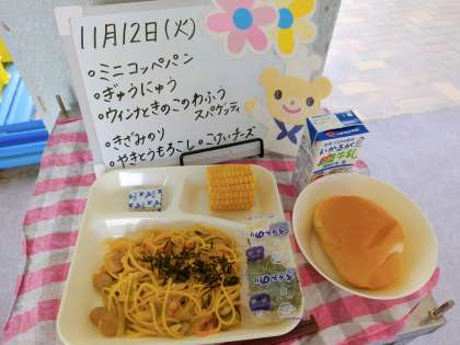 今日の給食は、ミニコッペパン、牛乳、ウインナーときのこの和風スパゲッティ(きざみのり)、焼きとうもろこし、固形チーズです。