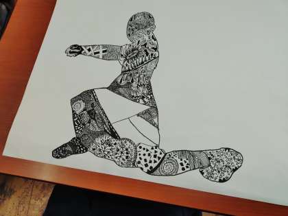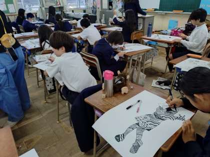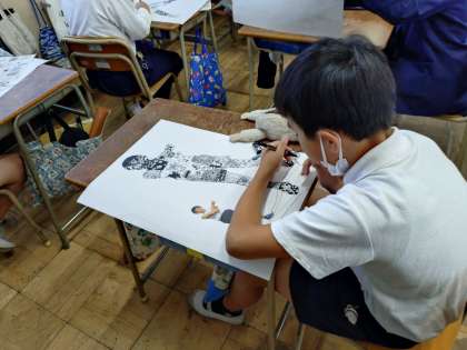 5年生は図画工作科で、「線描」に取り組んでいました。「線描」とは、ネームペンを使って、止まらず同じスピードで線を書いていきます。止まってしまうと、そこは点々になってにじんでしまいます。集中してきれいな線を描こうとすると、教室中が静まり返った中で、線を引く音だけが響いていました。