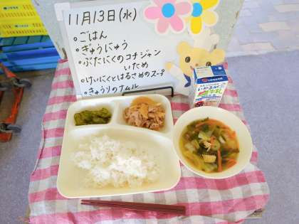 今日の給食は、ごはん、牛乳、豚肉のコチジャンいため、鶏肉と春雨のスープ、きゅうりのナムルです。