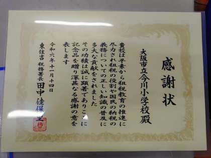 この賞は、長年「租税教室」の開催に取り組んだり、「税に関する習字」にたくさん応募し表彰を受けた利したことで、今川小学校が推進校に選定され、感謝状をいただきました。