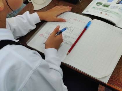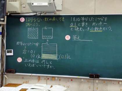 3年生は、算数で小数の単元に入りました。1リットルの10分の1が1デシリットルで、0.1リットルということから小数を導入していました。これから小数の足し算、引き算に入っていきます。小数点をそろえること。