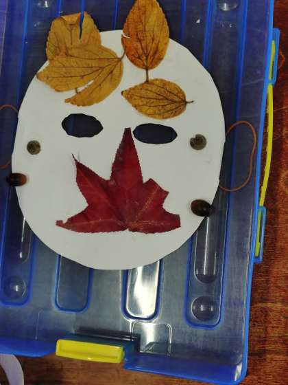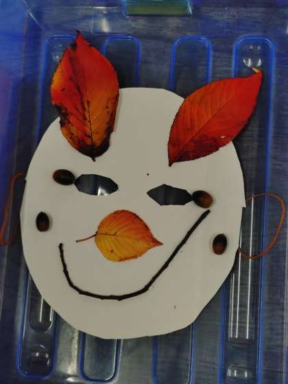 5時間目、1年生の教室に行くと、さっそく「秋のお面」づくりをしていました。拾ってきたドングリや赤や黄色の落ち葉を使って紙皿に接着剤を使って引っつけていました。怒っているような顔、笑っている顔、今にも泣きだしそうな顔といろいろ個性が出ていました。明日の朝登校してきたときには接着剤が乾いて完成しているでしょう。