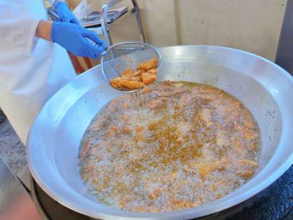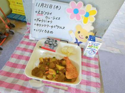 今日の給食は、えびフライカレーライス、牛乳、カリフラワーのピクルス、いりくろまめです。