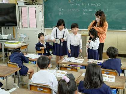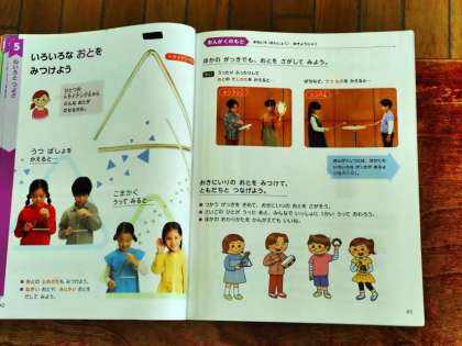 1年生は音楽で、トライアングルの学習をしていました。音を響かせながらたたき方を工夫して、元気な音、悲しい音などをたたいて音を出していました。