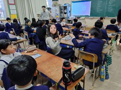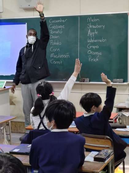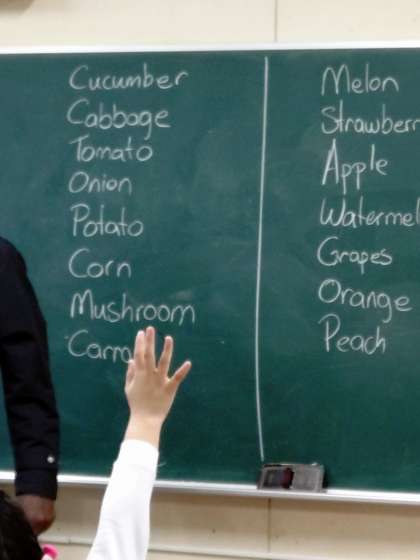 4年生の教室に行くと、友達同士向き合って、「どんな野菜が好き?}「オレンジ」「キュウリ」「モモ」など言い合って、単語を覚えていました。