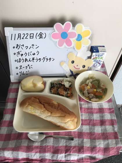 給食は、おさつパン、牛乳、ほうれん草のグラタン、スープ煮、りんごでした。