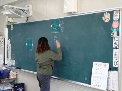 1年生の教室では、漢字ドリルを使って漢字の学習をしていました。入学したときは「ひらがな」や「カタカナ」の学習だったのに成長しています。「女」という字を習っていました。