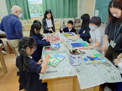 作品展に出すコリントゲームの制作風景です。板に絵の具で色を付けている人、ニスを塗っている人、乾かしている人など作業の進み具合がいろいろでした。