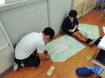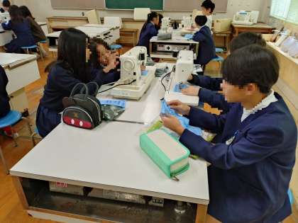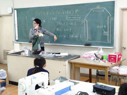 5年生は、家庭科室でミシンを出して、「エプロンづくり」をしていました。布を自分の身長に合わせて切り、袖を織り込み、待ち針で止め、アイロンでしつけをしてミシンで縫っていました。