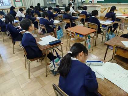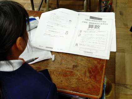 子どもたちは、いつも、B41枚のテストをやっていますが、経年変化ではそれでは得点は取れません。長い文章を読んで、理解して、資料などから読み取り、表現するという力が求められます。もちろん記述式で「80字〜100字でまとめなさい」という問題もあります。予行演習のつもりで取り組んでいました。来週火曜日と水曜日に実施します。大阪市の全員の子どもたちが同じ時間に同じ問題に取り組むことになります。テスト範囲は、4月から11月末までに習った範囲になります。国語の問題は初めて読む文章になります。